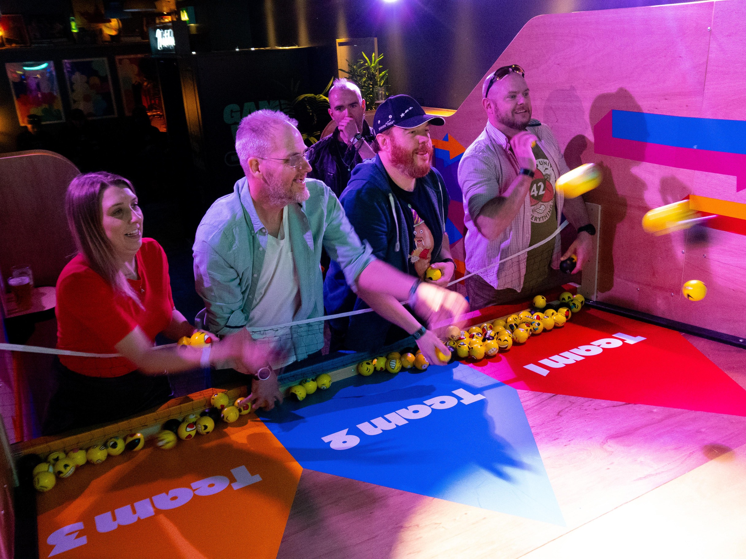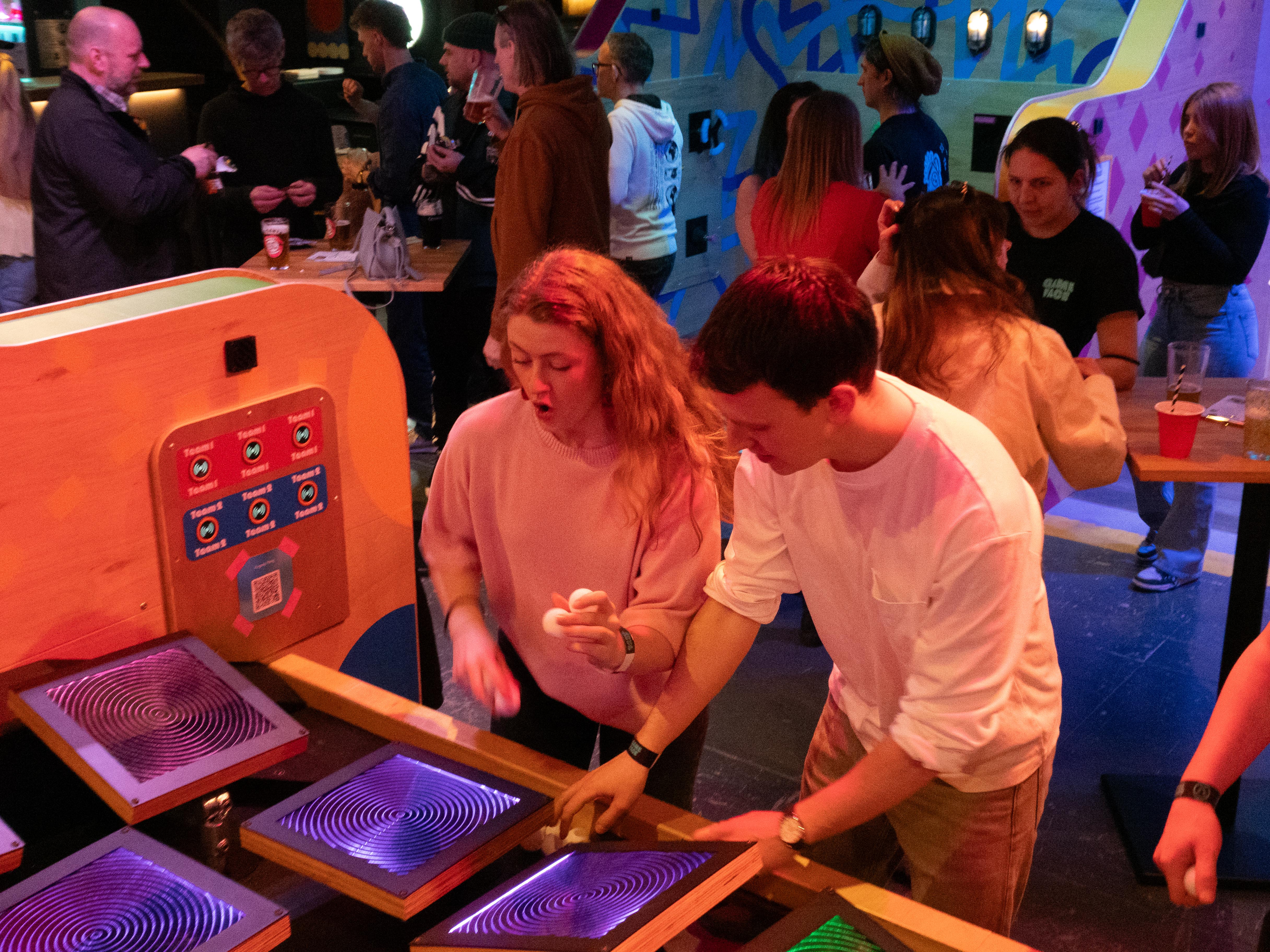 with a shared leaderboard for the whole venue, creating friendly competition and a chaotic energy.