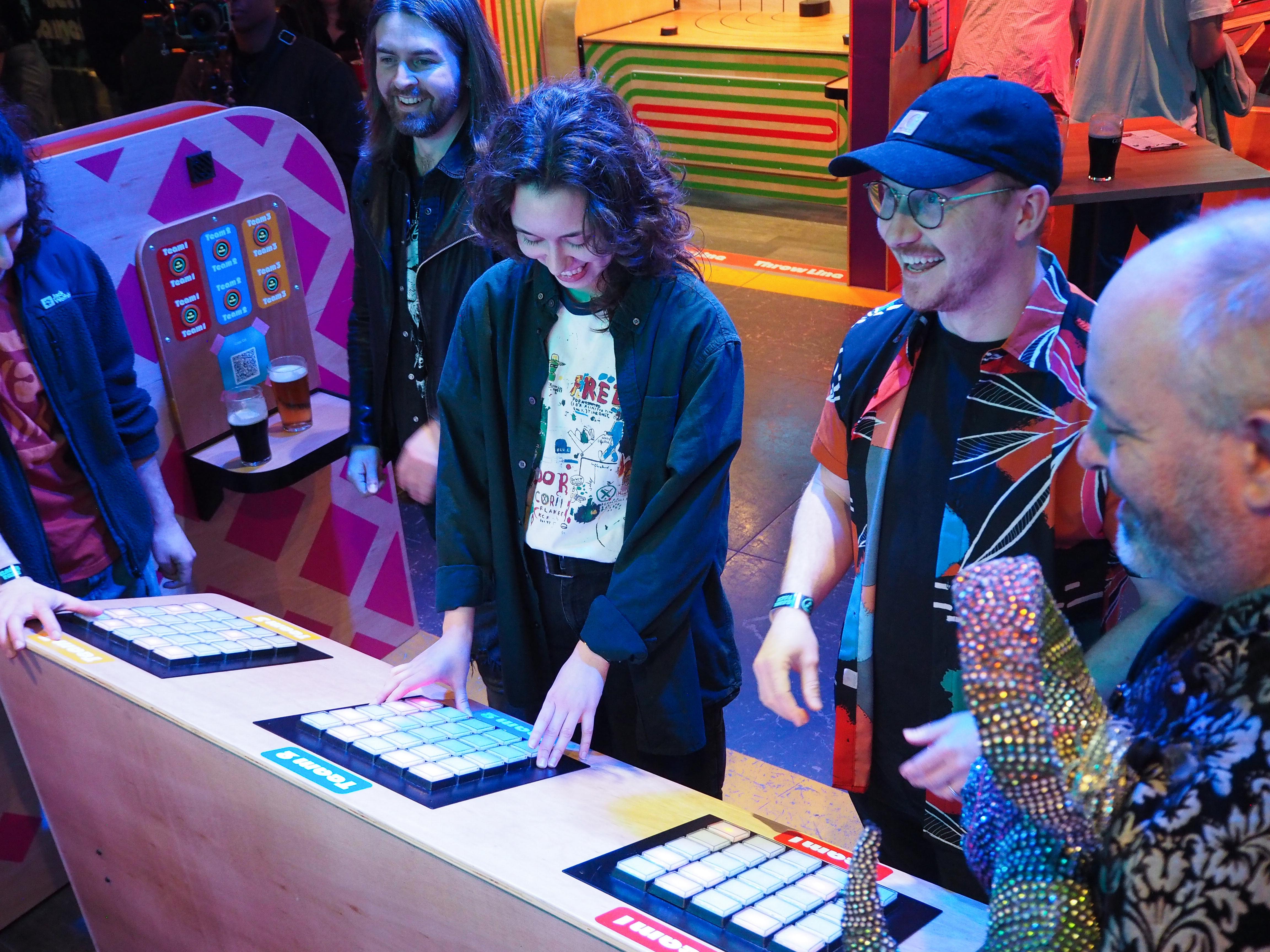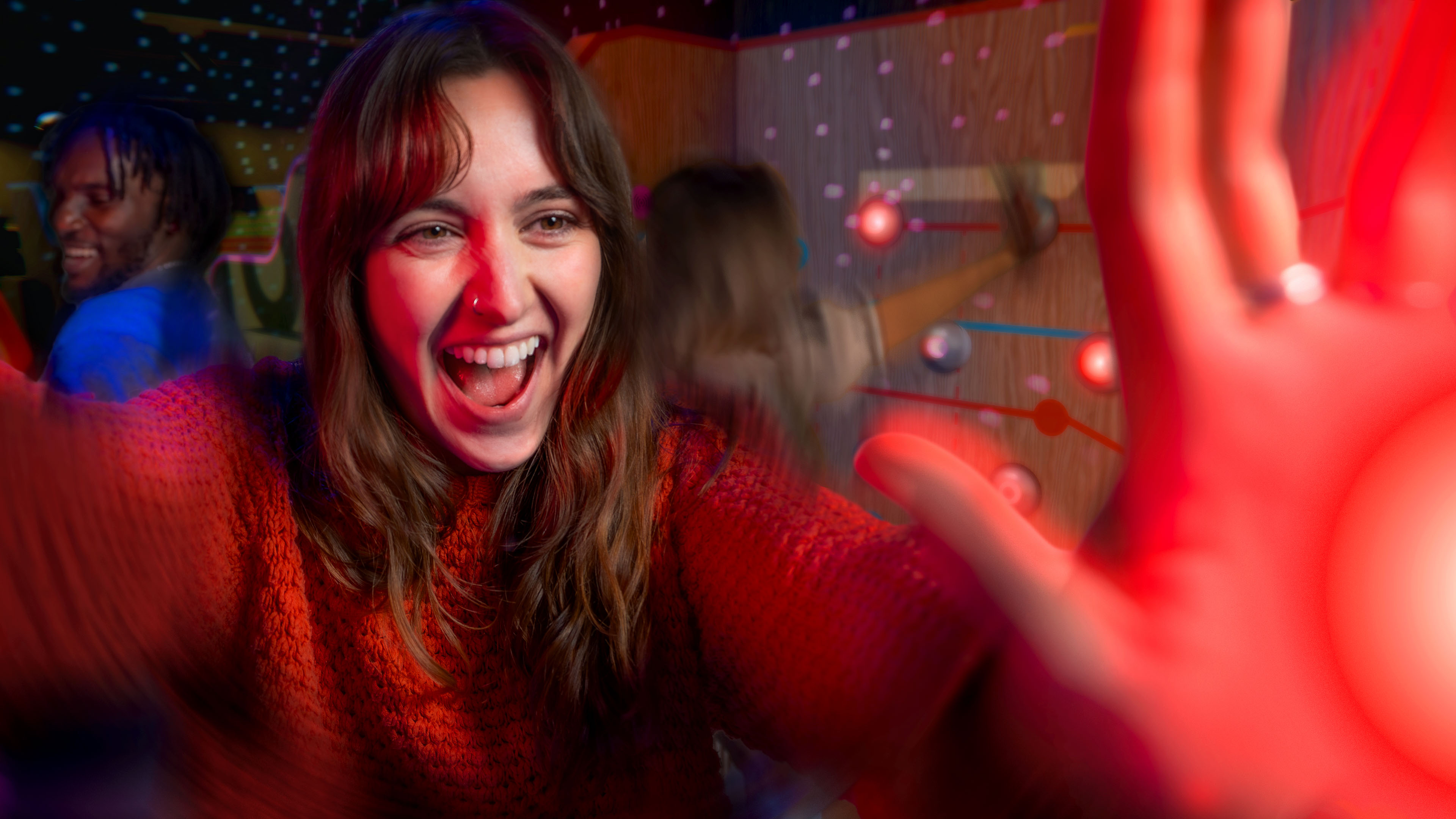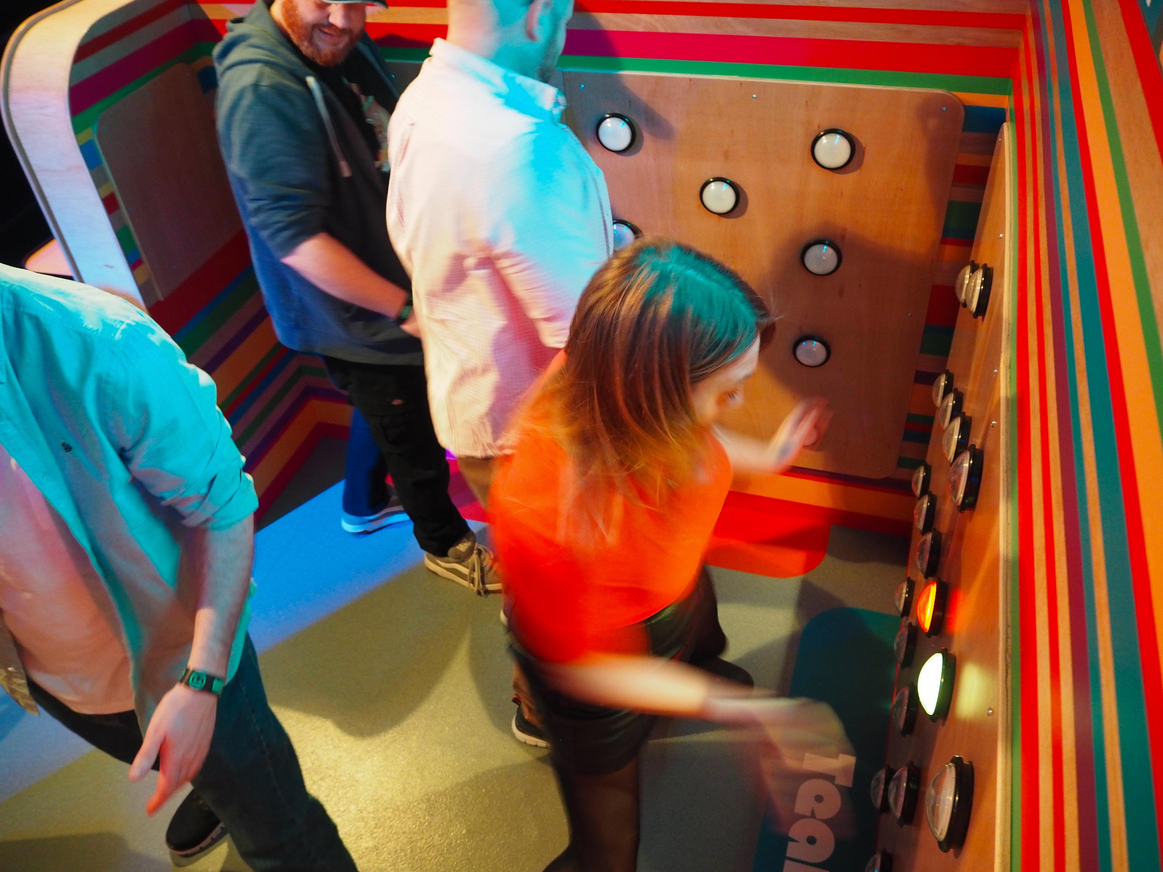 Buttons light up across the walls and floor, and players sprint, dodge and reach to hit their assigned targets before anyone else does.